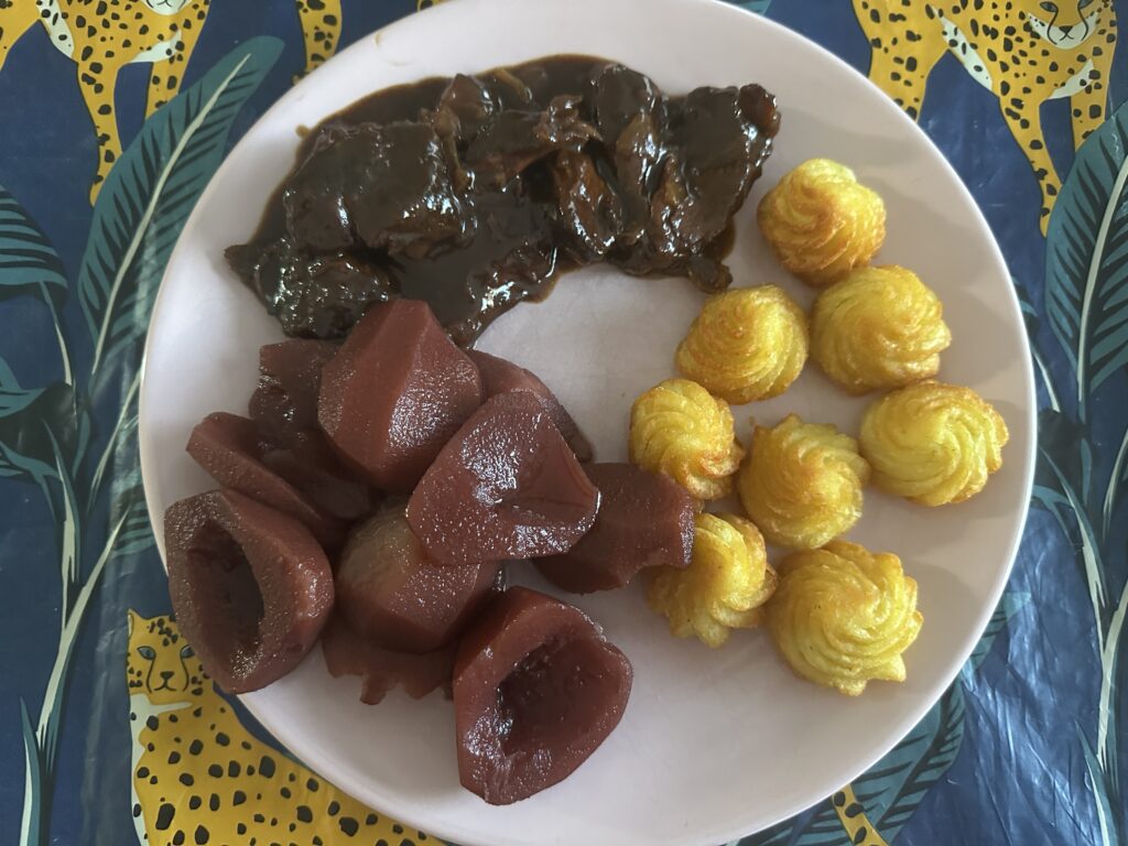 Naast stoofperen wil mijn tuttebel ook heel graag vulkaantjes (pommes duchesse) eten. Ze heeft geluk, want ook die eten we hier altijd bij. Op een beetje vlees na, gaat alles schoon op.
