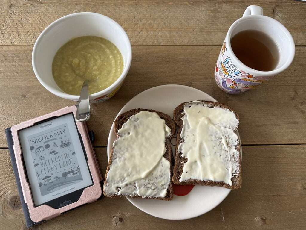 Tussen de middag duik ik nog even met mijn boek op de bank. Het lezen gaat allemaal niet zo hard en hoewel het echt een leuk boek is, lukt het me nu gewoon even wat minder.