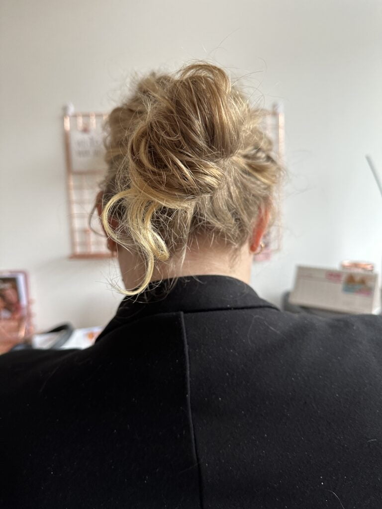 Ze maakt er een foto van en laat me zien wat ze met mijn haar heeft gedaan. Hartstikke knap van haar, maar het zit zo strak dat ik het na 5 minuten alweer los haal, anders krijg ik hoofdpijn.