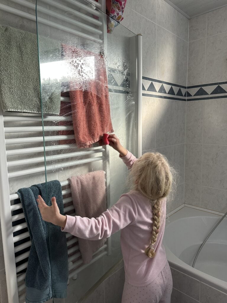 Als ik weer thuis ben gaat mijn bink broodjes halen bij Albert Heijn en vraagt mijn tuttebel of ze mag mee helpen met het poetsen van de badkamer. In het kader van jong geleerd, laat ik haar uiteraard mee helpen. Ze heeft er lol in en als ik tegen haar zeg, als je wat groter bent, wordt dit één van jouw taakjes, reageert ze heel enthousiast. Aansluitend zegt ze meteen, ik zeg nu dat ik het leuk vind, tegen de tijd dat ik het daadwerkelijk moet doen ben ik vast niet meer zo blij. Kleine wijsneus!