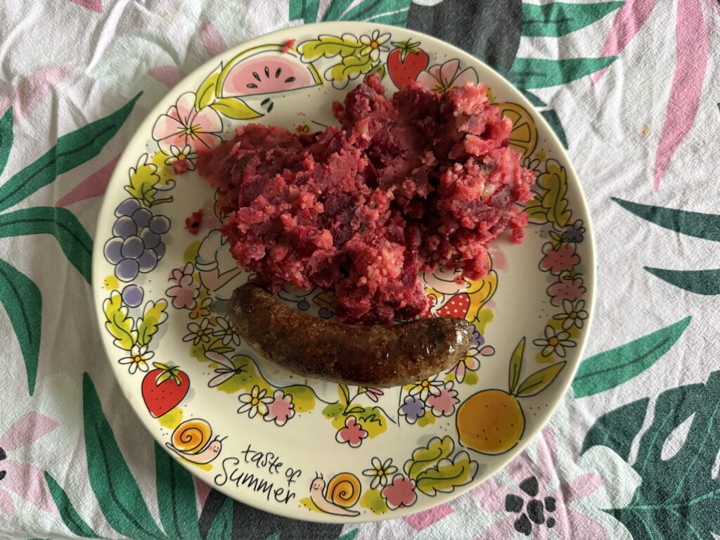 Voor het avondeten maak ik lekker bietenstamppot met een runderbraadworstje.