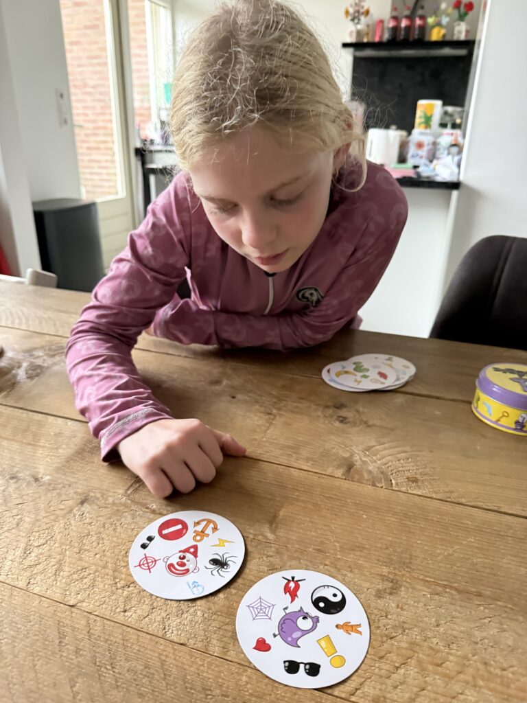 Mijn tiener denkt daar echter anders over en wil graag een spelletje spelen met mij. We spelen eerst speed cups en daarna Dobble.