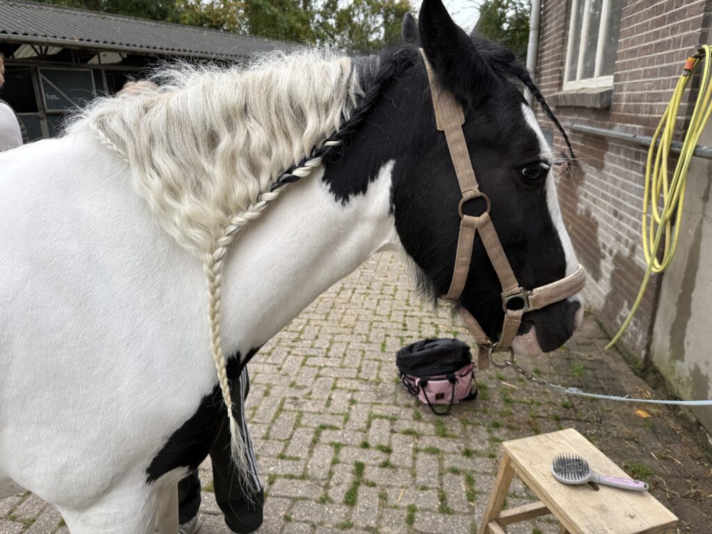 Ze mag als eerste op Daisy dus zorgen we ervoor dat ze helemaal mooi is, met haar haren in een merrievlecht en het wedstrijddekje erop.