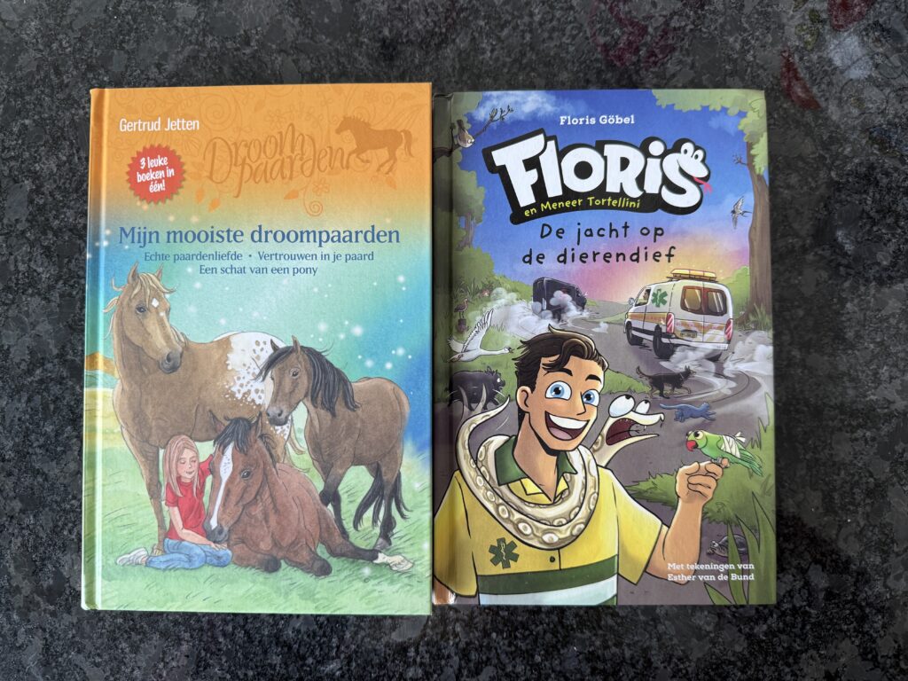 De kinderen mogen altijd boeken uitzoeken tijdens de kinderboekenweek en op de valreep kiezen ze beide nog een boek uit.