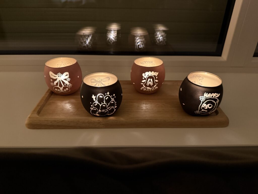 Bij Action heb ik gisteren dit plateautje meegenomen, eigenlijk om te gebruiken voor de borrelplank, maar ik heb toch een andere bestemming gevonden met deze waxinelichtjes erop. En het staat nog best grappig ook.