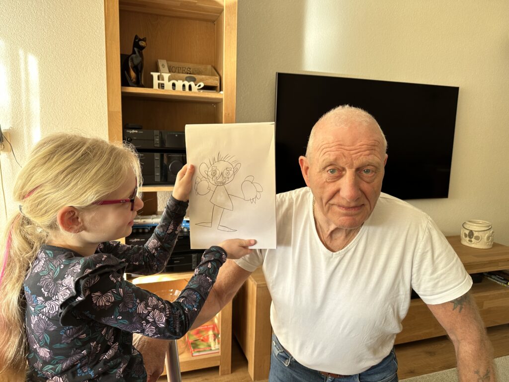 Als ik bij mijn ouders kom is mijn tuttebel druk bezig met tekenen. Ze heeft al paardjes getekend en allerlei andere dieren, maar ze tekent ook opa nog even na. Ze doet dat echt superleuk en ik ben echt dol op haar tekenkunsten.