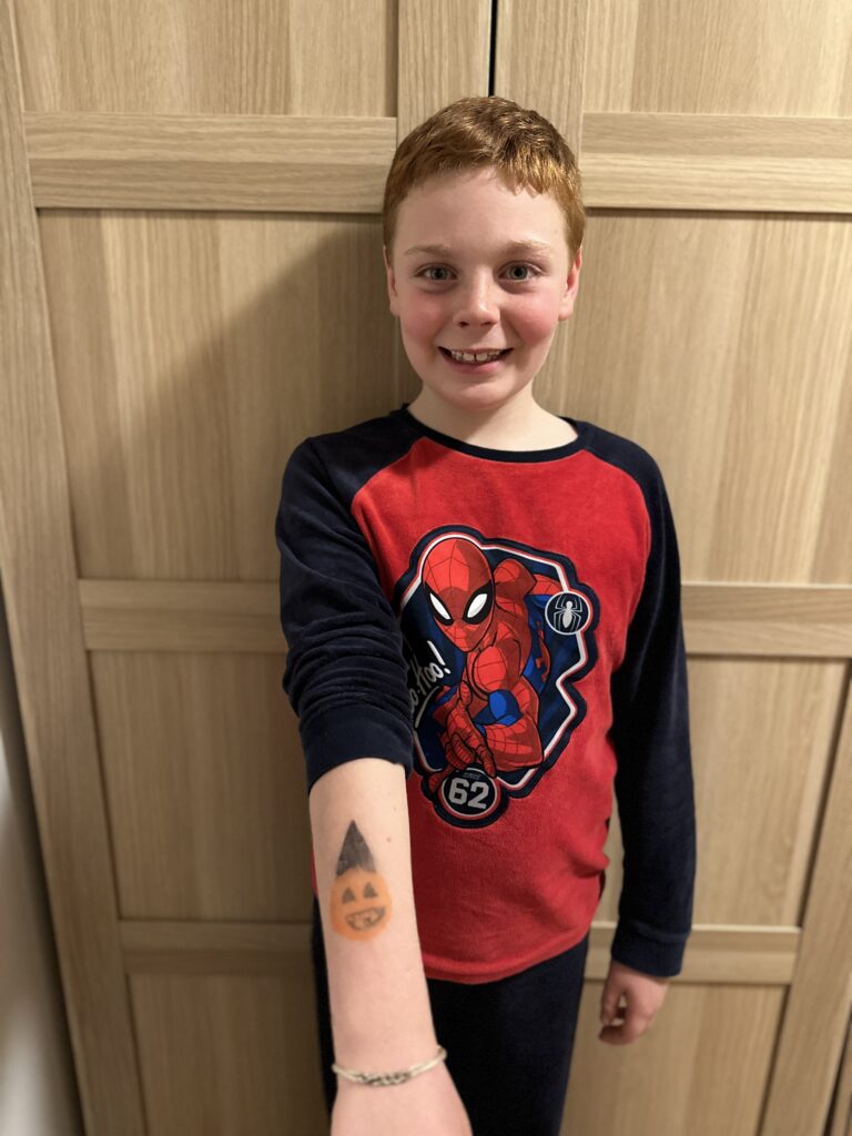 De kinderen hebben vandaag weer een bso dag en hoewel ze er niet echt zin in lijken te hebben, vermaken ze zich weer goed. Er is een Halloween activiteit en ze worden geschminkt. Aangezien mijn bink allergisch is heeft hij de tekening op zijn arm.