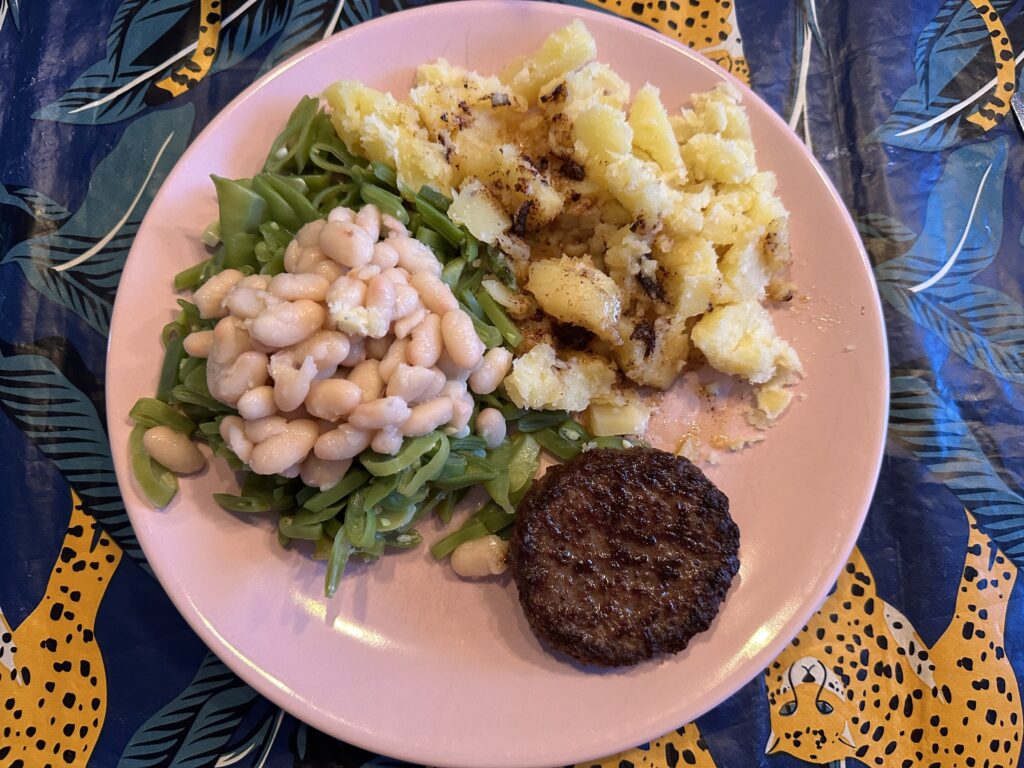 ’s Middags heb ik nog een gesprek met de juffen van school en aansluitend ga ik nog wat boodschappen doen. Voor het avondeten staan er gekookte aardappels, snijbonen met witte bonen en een hamburger op het menu. Simpel, maar lekker.