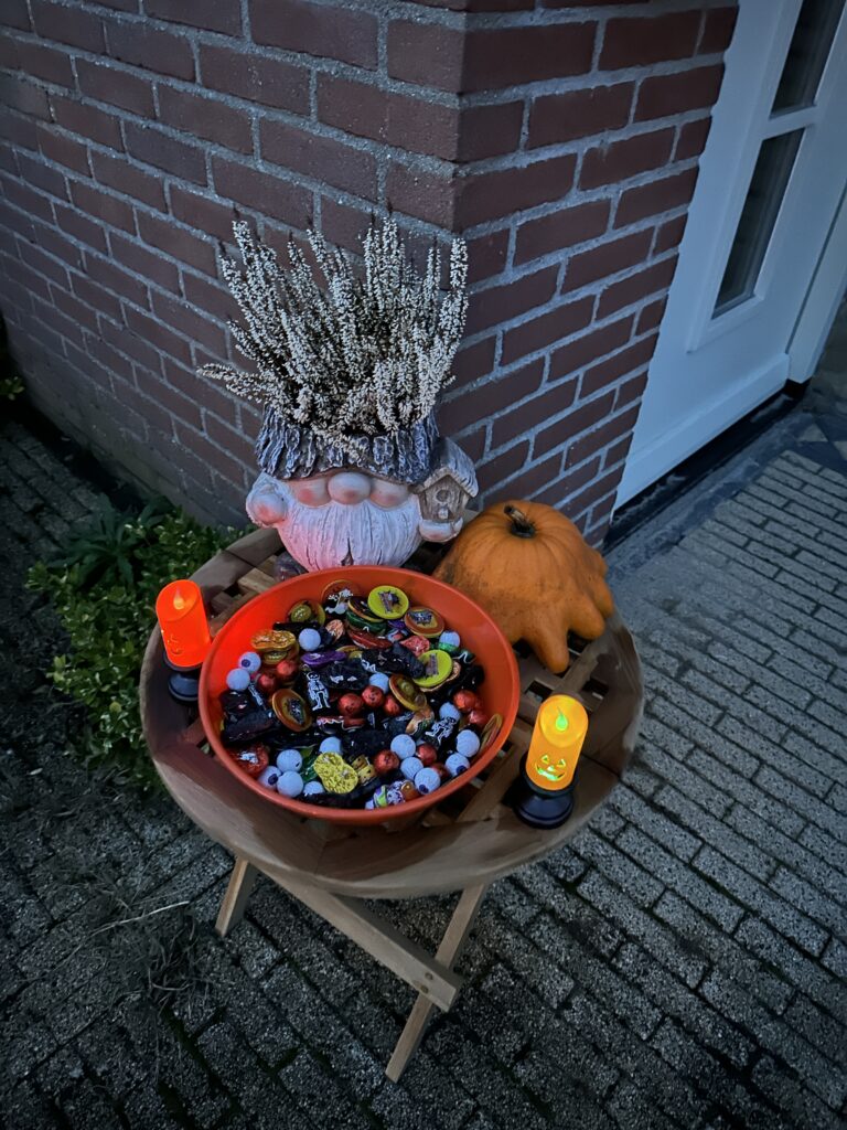 Dan is het tijd voor de Halloweenoptocht. De kinderen gaan met mijn vriendin en haar kinderen de route lopen, want ik kan niet mee, omdat ik bij mijn huis moet blijven staan om andere kinderen te ontvangen.