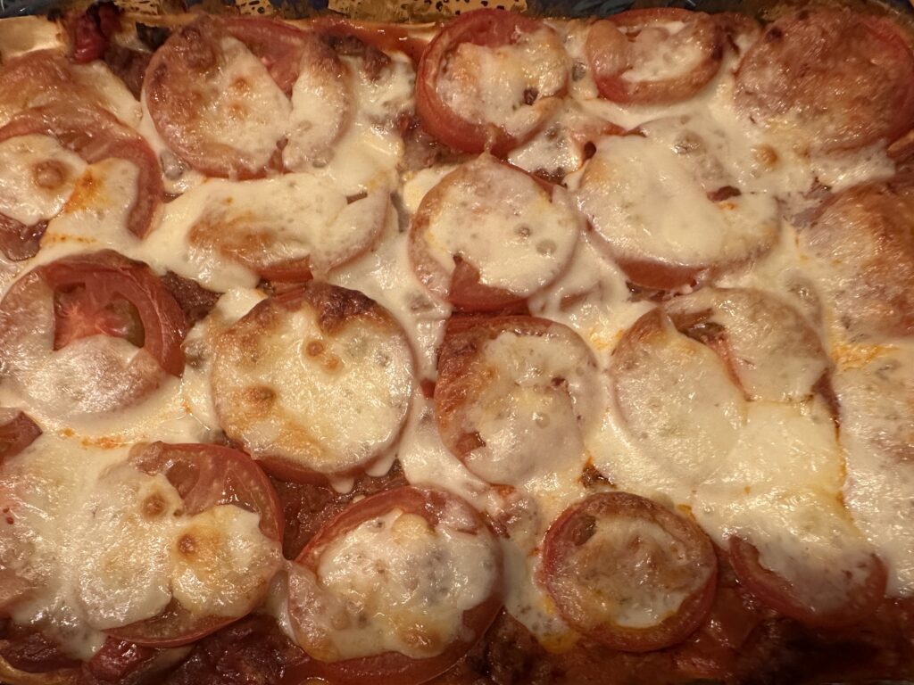 De lasagne is superlekker en er blijft nog slechts een klein stukje van over, wat we bewaren, want mijn puber wordt daar altijd erg blij van als we kliekjes eten.