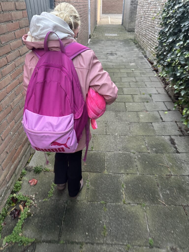 Voordat ik mag gaan werken breng ik eerst de kinderen naar school toe. Ze hebben er weer zin in.