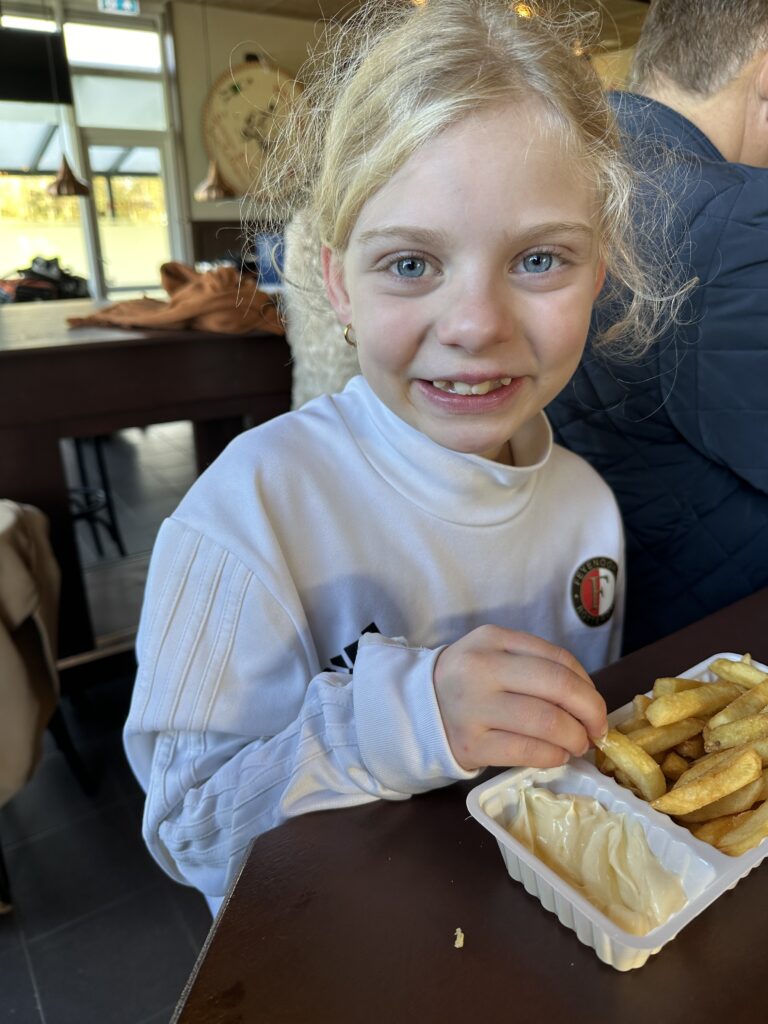 Mijn puber is vanmorgen al vroeg vertrokken voor zijn uitwedstrijd en ik ben bij mijn tuttebel gebleven, die een goede wedstrijd speelt, ook al verliezen ze met 6-9. Na afloop heeft ze uiteraard wel een frietje verdiend.