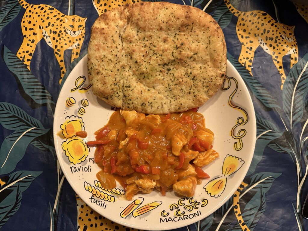 Voor het avondeten heb ik butterchicken gemaakt, waar we lekker naanbrood bij eten.