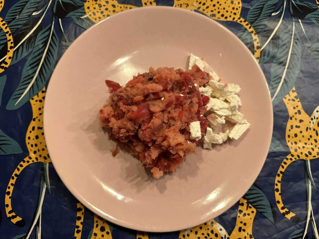 Voor het avondeten maak ik bietenstamppot met witte kaas, uitjes en spekjes, een recept van één van mijn vriendinnen.