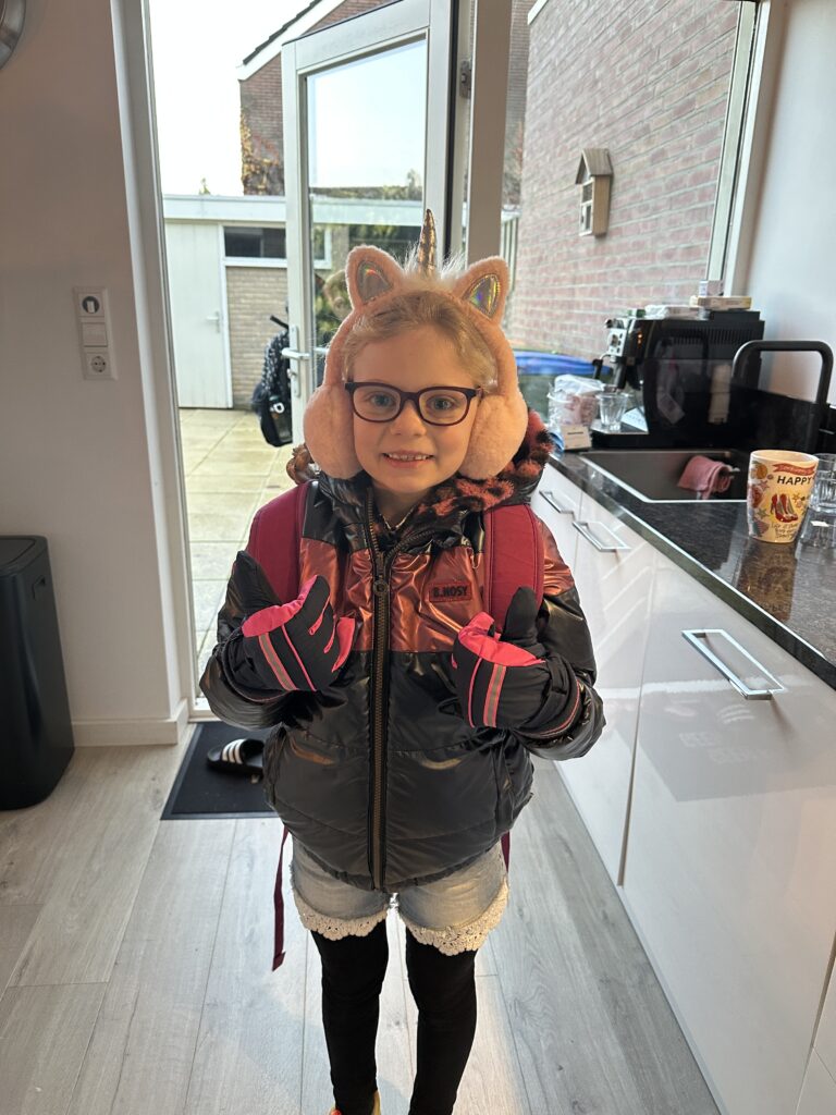 Mijn kind heeft het koud, nu al, dus trekt ze handschoenen aan en zet ze haar oorwarmers op .Van de winter krijgt ze een centrale verwarming om haar nek, want dan is dit niet meer genoeg.