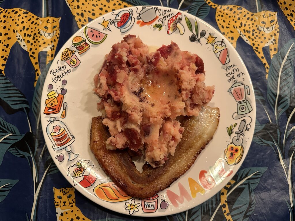 Voor het avondeten maak ik een bietenstamppot. Waar mijn tuttebel er vorige keer wat minder van heeft gegeten, heeft ze er nu echt wel van gesmuld.