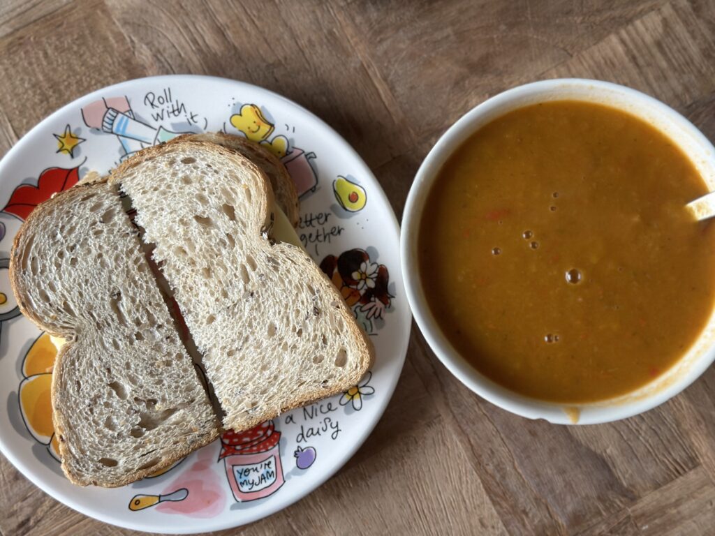 Tussen de middag heb ik voor de lunch lekker een kom zoete aardappel paprikasoep en twee boterhammen.