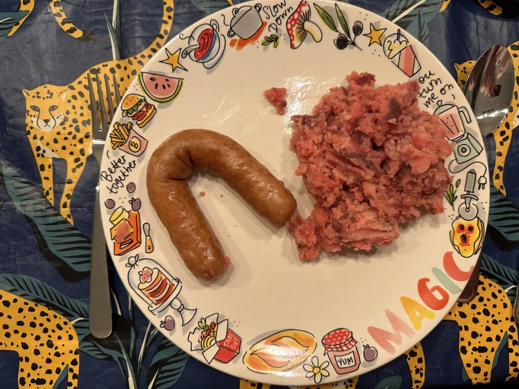 Aangezien mijn tuttebel echt niet blij wordt van nacho’s, heb ik voor haar nog een kliekje van de bietenstamppot. Ze heeft er lekker een mini rookworstje bij, die ik per ongeluk verkeerd heb besteld.