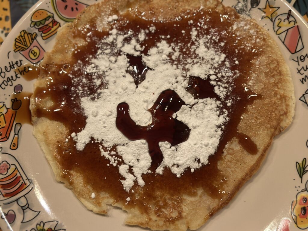 Net als de lunch is ook het avondeten een feestje. Mijn puber zag vanmorgen tijdens het tafel dekken een pak pannenkoekenmix staan en met een pak melk op de datum, is daarmee de keus voor het avondeten meteen gemaakt. Mijn tuttebel maakt er met stroop en poedersuiker een leeuw van. Ze zit na deze pannenkoek ook meteen vol, wat ik niet heel gek vind.