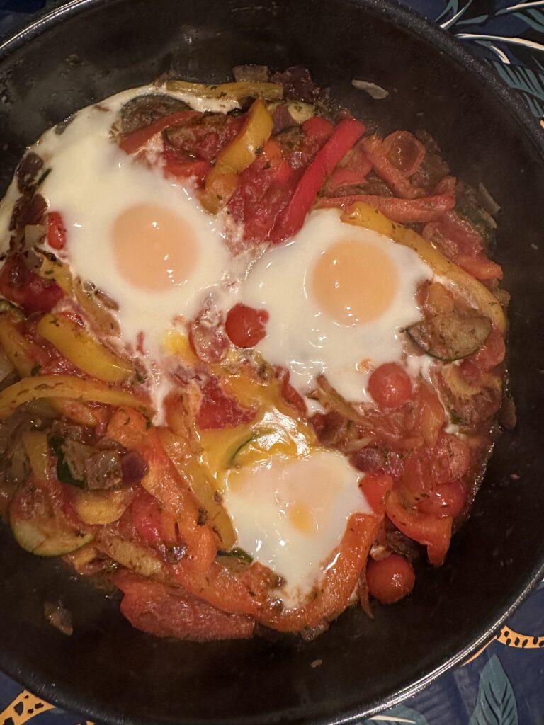 Voor het avondeten maak ik een heerlijk vega gerecht, shakshuka. Hoewel het vrij weinig lijkt in de pan is het echt meer dan voldoende voor met zijn drietjes.