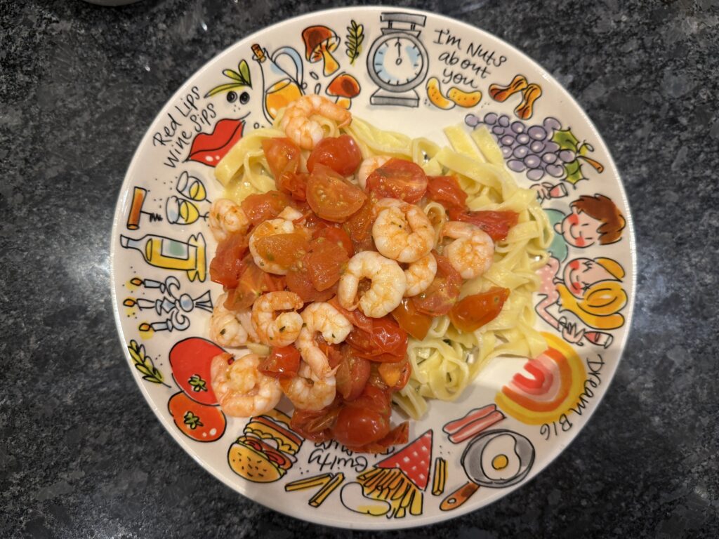 We eten heerlijke tomaat garnalen pasta vanavond, op verzoek van mijn tiener.
