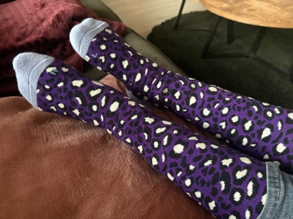 Het is paarse vrijdag en dus heeft mijn puber hiervoor speciaal paarse skisokken van mij aangetrokken. Het wordt beloond met lekkers, omdat hij er moeite voor heeft gedaan.