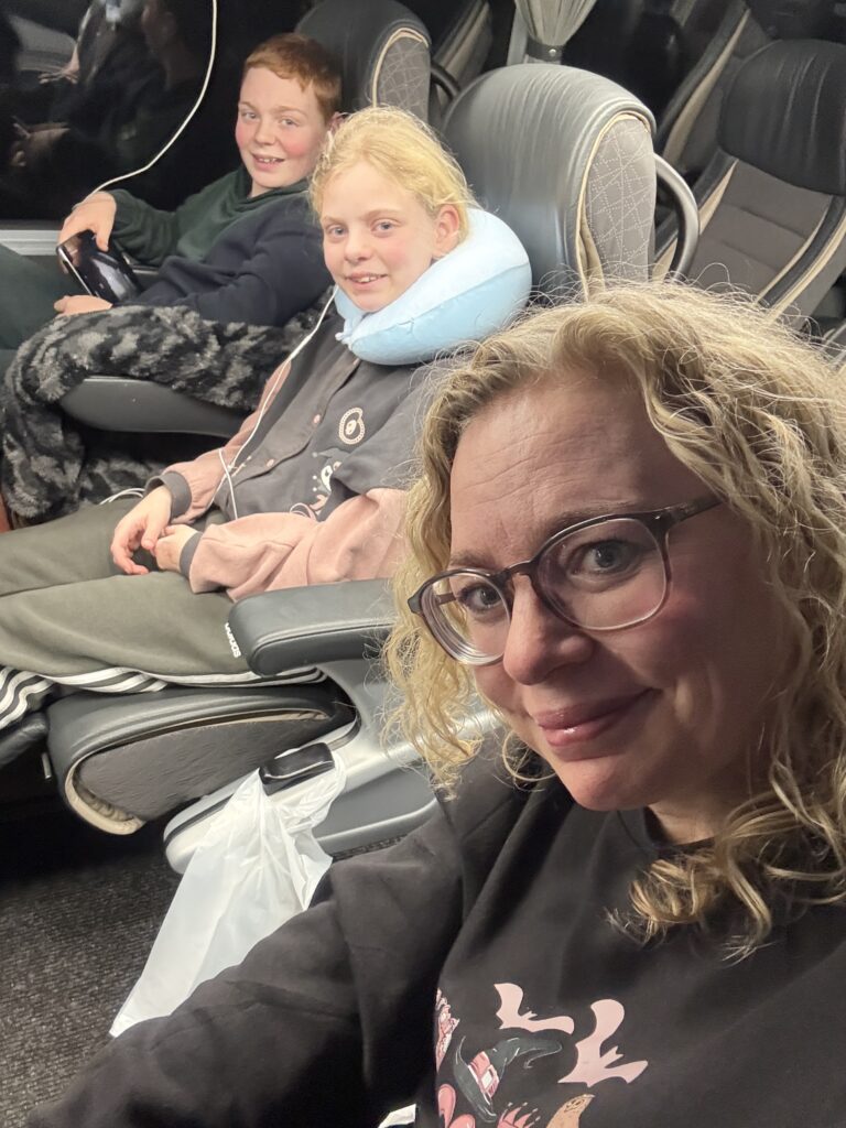 De kinderen slapen onrustiger dan normaal in de bus, maar ik kan ze toch nog even zo lief slapend vast leggen. Voor mij is de reis niet fantastisch, maar daar ben ik tegenwoordig op voorbereid en dat is ook helemaal goed.