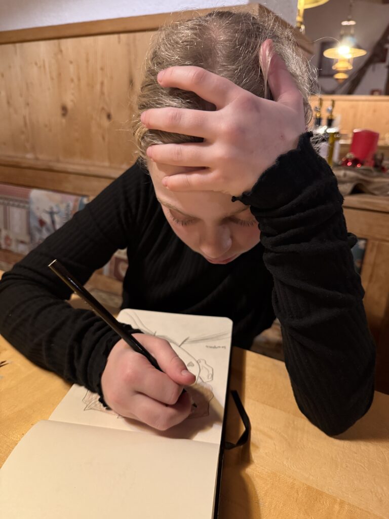 Na het skiën vind ik mijn tiener in de bar van het restaurant, waar ze heerlijk zit te tekenen.