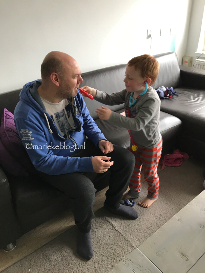 Ook nu starten we weer rustig op. We kijken televisie en als Erik uit bed is, ga ik de was doen. Luca is doktertje aan het spelen met Erik.