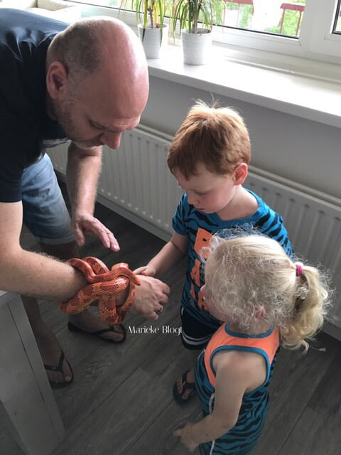 En ’s avonds na het avondeten, gaan we bij de bovenbuurvrouw naar de slangen kijken.