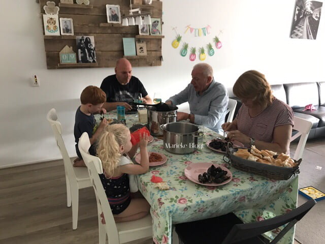 Rond kwart voor zes komen mijn ouders op visite. We gaan met zijn allen mosselen eten, onze jaarlijkse traditie. Voor de kinderen heb ik pizza gehaald, maar achteraf blijkt dit niet nodig te zijn, want mijn olijke duo eet zich vol aan de mosselen.