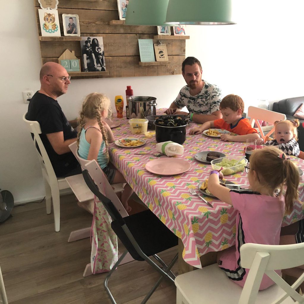 Vandaag zouden mijn ouders mosselen komen eten, maar mijn vader voelt zich niet goed. Dus vraag ik aan de man van mijn vriendin of hij ons wil komen helpen met het opeten van vier kilo mosselen. Uiteraard komen mijn vriendin en de kinderen ook mee. En voor mijn binkie weer een zelfstandig moment, want hij mag alleen naar de snackbar aan de overkant toe om frietjes te halen. Uiteraard ook een loslaat momentje voor deze moeder, maar hij doet het supergoed.
