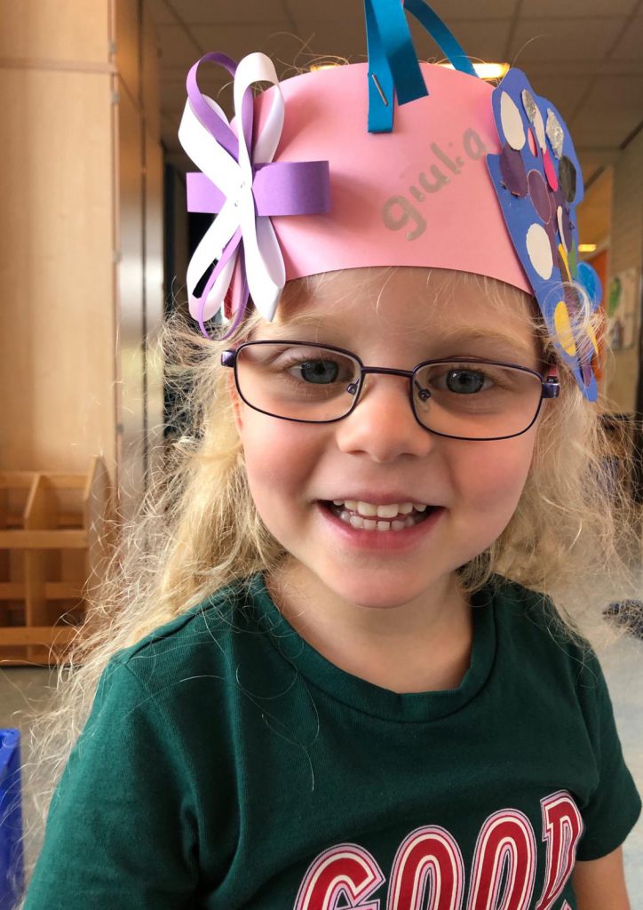 We brengen daarna samen de traktatie naar school toe, waar mijn tuttebel trots rondloopt met een mooie verjaardagshoed.