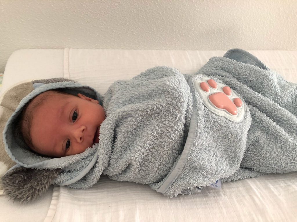 Zoals gezegd heeft mijn zusje de badcape uitgebreid getest met mijn lieve babyneefje. En hoewel ze even heeft moeten wennen aan de manier waarop ze de handdoek om moest doen.