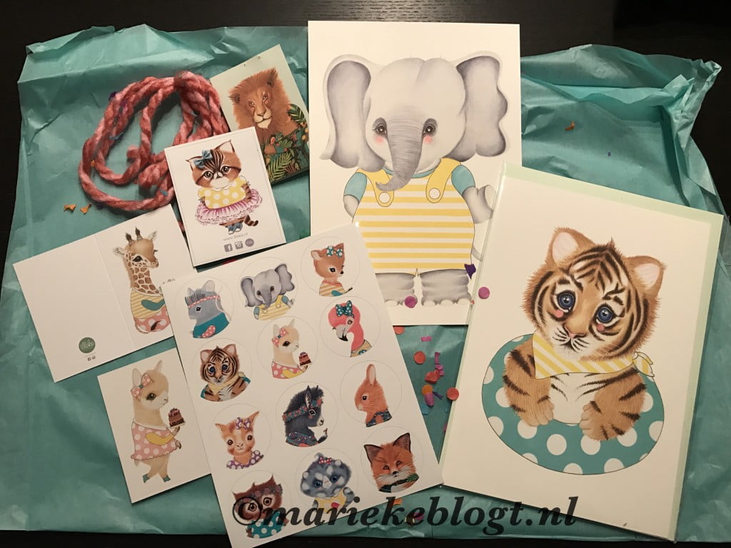Ook hier in huis zijn we fan van Ihlja’s illustraties. Op het wandbord staan twee van haar ontwerpen, namelijk Luca het welpje en Giulia het ezelinnetje. Allebei de dieren zijn inderdaad vernoemd naar Luca en Giulia. Wat ik echt superlief vind! Als ik Illeke mail, zoals ik het altijd noem, ontvang, word ik alleen al heel erg blij van het uitpakken. Ze maakt er echt een feestje van. Met mooi papier, wolletjes en confetti, ik houd ervan!