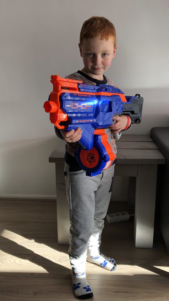 Maar hij wil natuurlijk heel graag zo’n grote Nerf, die is nog veel stoerder natuurlijk.