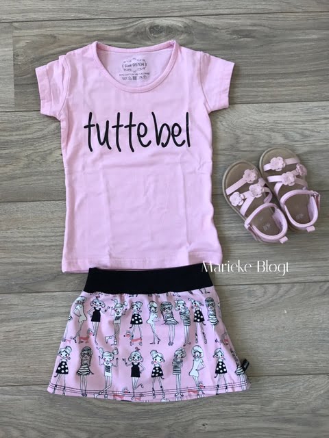 Van Joyce mocht ik een rokje en een shirtje uitkiezen voor Giulia. Op de site viel al meteen het rokje met de meisjes op, het is een echt Giulia-rokje en ik wist meteen dat ik die wilde hebben. Op Facebook zag ik de shirtjes met tut en kletskous al eens voorbij komen. Beide hartstikke leuk, maar aangezien ik mijn kleine meid altijd (mijn) tuttebel noem, vond ik dat eigenlijk leuker. Dus stuurde ik Joyce een berichtje en vertelde mijn wens. Voor Joyce was dit absoluut geen probleem en ze maakte het shirtje en stuurde de volledige set naar me op.