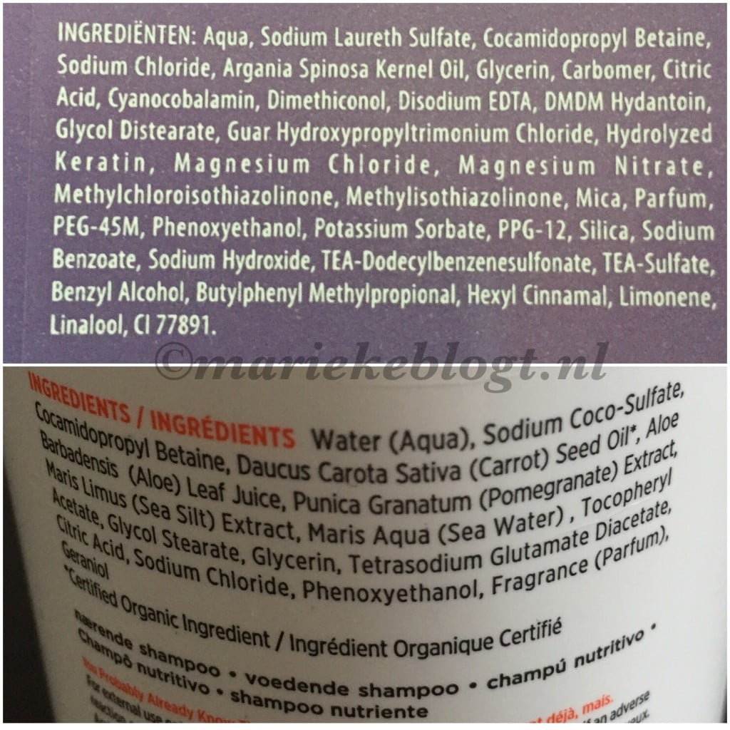 In Yes to Carrots zitten minder toegevoegde middelen zoals sulfaten en siliconen, die de shampoo die ik normaal gesproken gebruik wel bevat. Dat was voor mij de hoofdreden, want ik was wel erg benieuwd of die bestanddelen medeveroorzaker zijn van het seborroïsch eczeem. Naast het feit dat het weinig troep bevat, (34 tegenover 11 chemische middeltjes, zie ook de foto met de werkzame stoffen) had ik ook begrepen dat het voor mensen met krullen echt een wondermiddel is. Je schijnt er nog meer krullen van te krijgen en het wordt er een stuk gezonder van.
