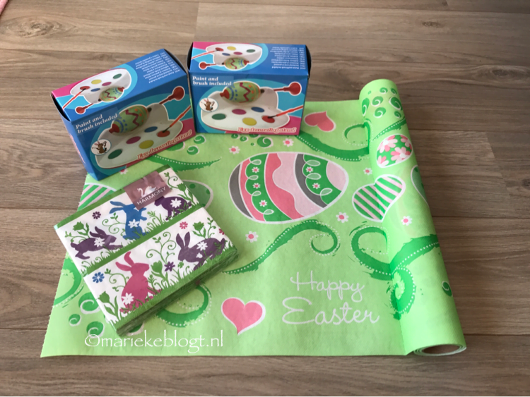 En je kan er nu al bijna niet meer om heen,paasartikelen! Ik nam alvast twee eierhouders mee zodat de kinderen hun ei kunnen verven met Pasen. De eierhouders zijn € 0,55 per stuk. Ook hebben ze nog knutseleieren om te verven. Die liet ik voor nu nog even liggen, maar wie weet haal ik die ook nog wel. Is toch wat makkelijker misschien dan met echte eieren. Ook nam ik alvast een rol met tafellopers en servetten mee, waar ik € 1,89 en € 0,69 voor heb betaald. De tafellopers en servetten zijn er in diverse varianten. Ik vond deze het leukste. Verder nam ik nog niks mee, omdat ik eerst eens moet kijken wat ik nog heb liggen van vorig jaar.