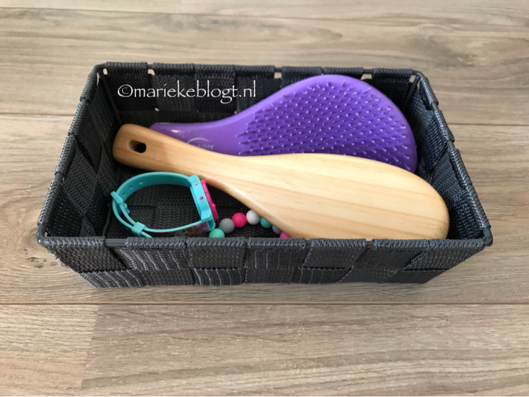 Voor op Giulia’s kast kocht ik nog een grijs mandje. Hier liggen alle losse spulletjes in die nu op haar kast lagen, zodat het niet meer zo rommelig oogt. Het mandje kostte € 0,89.